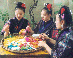 侗族地區(qū)大多日食四餐,兩飯兩茶。飯以米飯為主體。平壩多吃粳米,山區(qū)多吃糯米,糯米種類很多,有紅糯、黑糯、白糯、禿殼糯、旱地糯等等,其中香禾糯最有名。他們將各種米制成白米飯、花米飯、光粥、花粥、粽子、糍粑等,吃時(shí)不用筷子,用手將飯捏成團(tuán)食用,稱為“吃摶飯”。