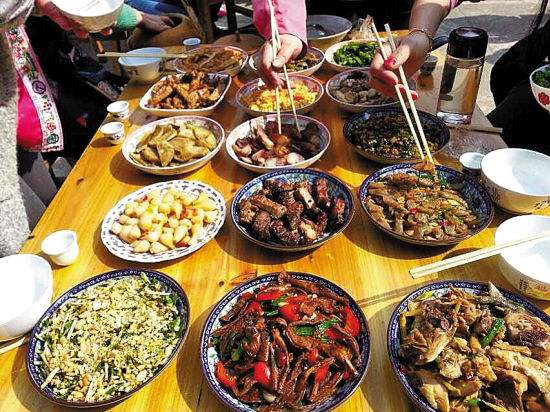 蔬菜大多制成酸萊。魚鮮包括鯉魚、鯽魚、草魚、鱔魚、泥鰍、小蝦、螃蟹、螺螄、蚌之類,可制成火烤稻花鯉、草魚羹、鮮炒鯽魚、吮棱螺、酸小蝦、酸螃蟹等風(fēng)味名肴。肉品主要是豬、牛、雞、鴨肉,吃法與漢族差別不大。瓜果有刺梅、獼猴桃、烏柿、野楊梅、野梨、藤梨、飽飯果、刺栗、大王泡,以及松村嫩皮、桑樹嫩皮、香草根等。其中,櫟木的果實(shí)可做成豆腐,“香樹”的皮可潔白牙齒,油茶樹上長(zhǎng)的“茶泡”是天然的酸甜汁。野味包括鼠、蛇、蝌蚪、四腳蛇、幼蟬、幼蝗、土蜂蛹、石蛙、穿山甲、囡囡魚,以及吃松果長(zhǎng)大的松香雞和松香豬,侗族均能巧加利用。菌耳方面有松菌和鮮美的雞絲凍菌,還有可制粑粑與粉絲的藤根、葛根,水田生長(zhǎng)的細(xì)微苔絲,隨處可見的竹筍。飲料主要是家釀的米酒和“苦酒”,以及茶葉、果汁。據(jù)粗略估計(jì),侗族的常見食料不少于五百種,天上飛的,水里游的,地上長(zhǎng)的,草中爬的,只要能吃,無不取食。顯示出他們的聰明才智和很強(qiáng)的生存適應(yīng)能力。