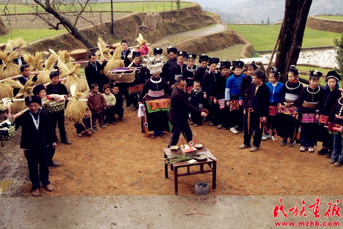 苗族送親隊(duì)伍來到新郎家的寨口,寨老為新娘主持“回喜神”儀式。楊昌垠,引自民族畫報(bào)