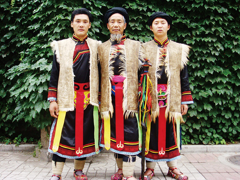 圖片左為楊俊清,中為老釋比朱金龍(楊俊清的老師),右為余正國(guó)(原是一名當(dāng)?shù)氐那颊Z(yǔ)老師)。他們是當(dāng)?shù)赜忻尼尡取? 梁黎2008年攝于北京