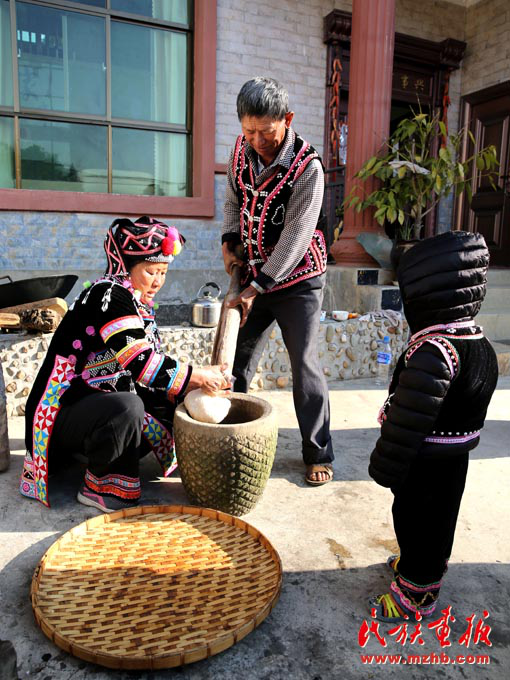 張俊波父母一起舂粑粑,準(zhǔn)備正月初三拜年用
