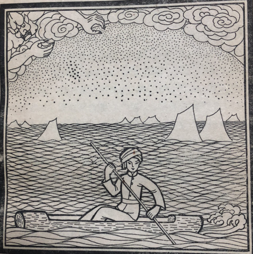 厄霞看見札努札別依然沒有餓死,又想出了一條毒計:他把天河上的水放下來,整個大地變成白茫茫一片汪洋大海。跑到高山去的人僥幸沒有淹死。住在平地上的人,都被洪水淹死了,厄霞以為這一次札努札別也一定淹死了。但當厄霞來看時,札努札別坐在掏空了的木槽里漂在水面上,依然沒有淹死。于是,原來不知道造船的人們,從這次起,后世便知道造船了。