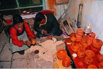 木碗的來(lái)源,一是西藏自己生產(chǎn)的,還有一種是云南迪慶生產(chǎn)的,都是從西藏的市場(chǎng)上交換或購(gòu)買(mǎi)的。西藏林芝地區(qū)的朗縣、察隅,山南地區(qū)的加查、隆子、錯(cuò)那,阿里地區(qū)的噶爾等地均產(chǎn)木碗。其中尤以錯(cuò)那生產(chǎn)的“察牙”木碗和噶爾生產(chǎn)的“堆旭”木碗最負(fù)盛名。以上木碗的原料選擇樹(shù)根或樹(shù)瘤車(chē)制而成,選料之講究,做工之精細(xì),使好木碗的花紋各異,或磷火紋,或豬鬃紋,或貓頭鷹眼紋,這些木碗都很名貴,與普通木碗之間的價(jià)格也很懸殊,一個(gè)上等木碗價(jià)值10頭牦牛,一般人家是不敢問(wèn)津的,但也盡量想方設(shè)法弄個(gè)像樣的,以慰平生。
